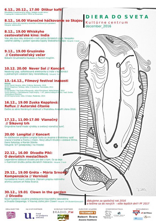 Prijali sme pozvanie do Diery do sveta a rozhodli sme sa "svojou troškou" prispieť do vianočnej nálady. Môžete sa tešiť aj na Simonku Hulejovú a jej oddychové piesne, ktoré vám padnú vhod ku skvelej káve, či vianočnému punču. Od šikovných tvorcov si môžete doplniť nejakú drobnosť pod vianočný stromček a máte možnosť si darček i originálne tvrivo zabaliť, vyrobiť menovky na darčeky.....